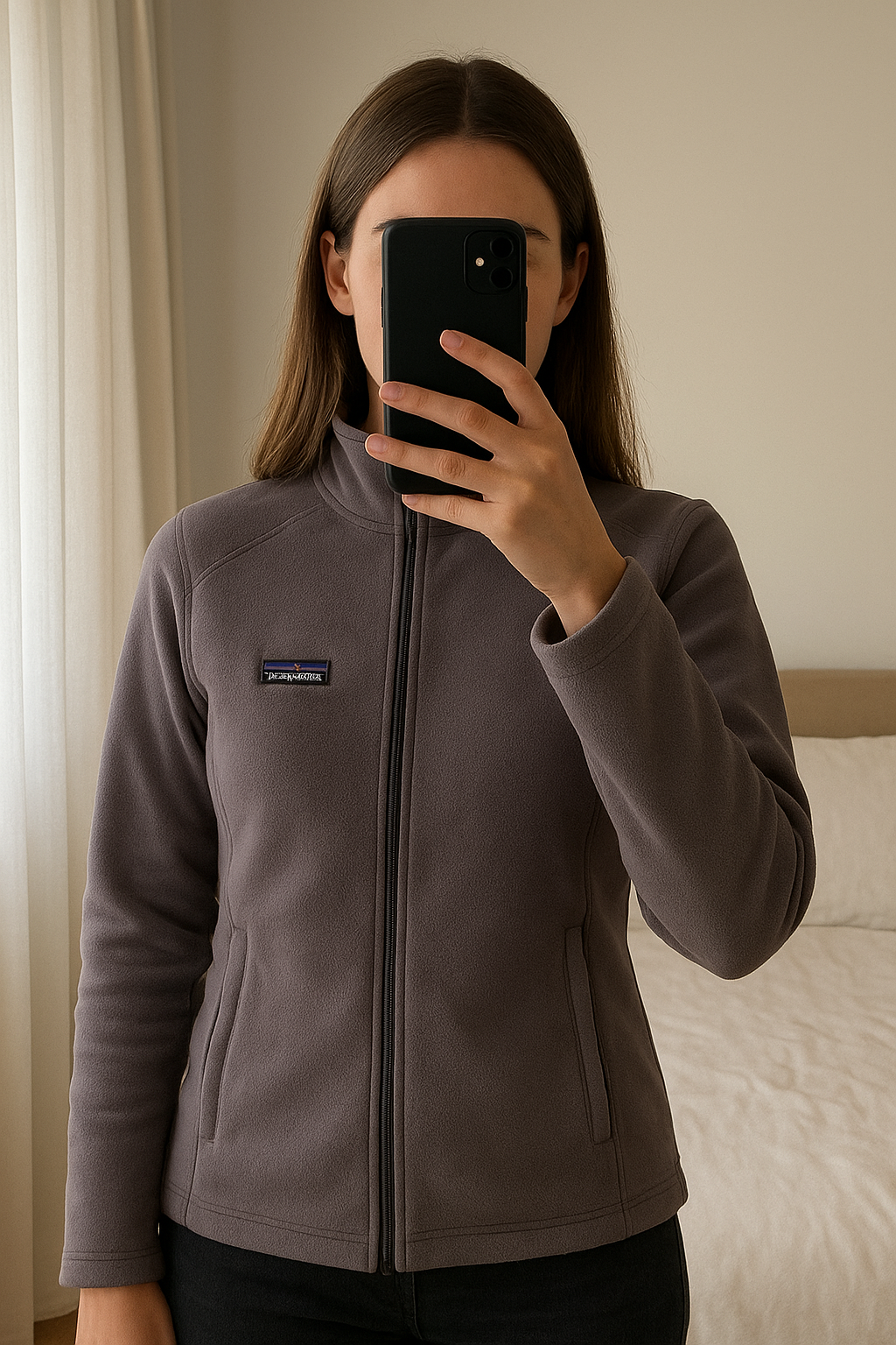 Veste Polaire Patagonia Grise – Taille S - SKU 48 debout, face à la caméra, dans une chambre à la lumière douce, avec une lumière naturelle filtrant par la fenêtre.
