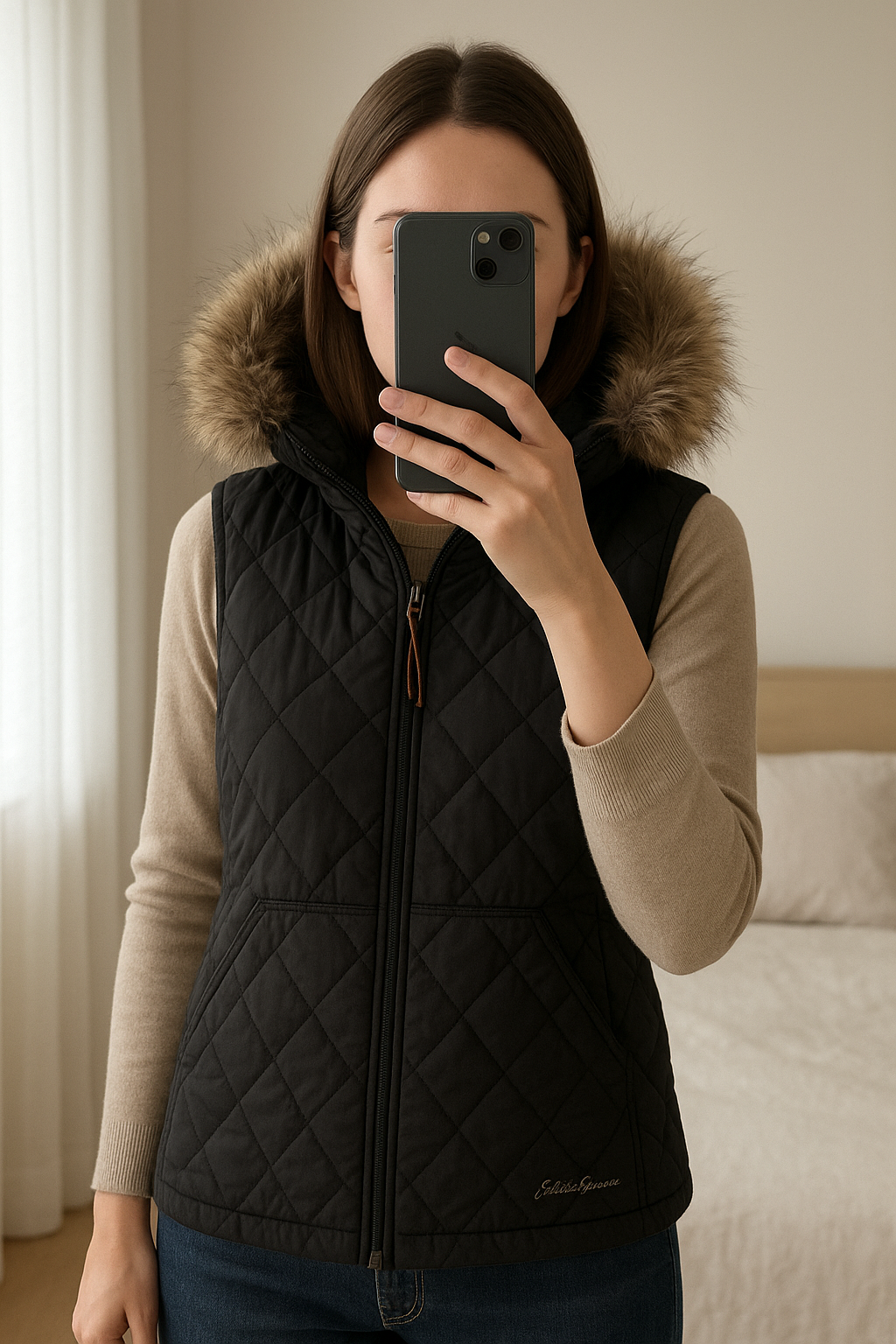 Veste sans manche avec capuche debout, face à la caméra, dans une chambre à la lumière douce, avec une lumière naturelle filtrant par la fenêtre.
