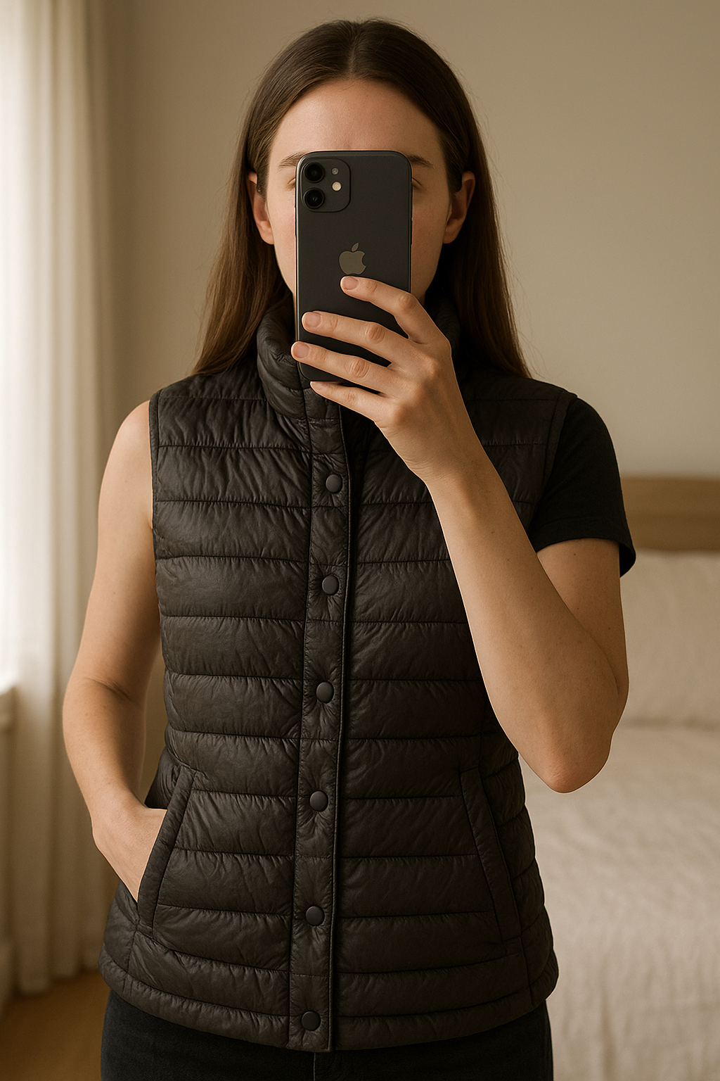 Veste sans manche doudoune sans manche debout, face à la caméra, dans une chambre à la lumière douce, avec une lumière naturelle filtrant par la fenêtre.