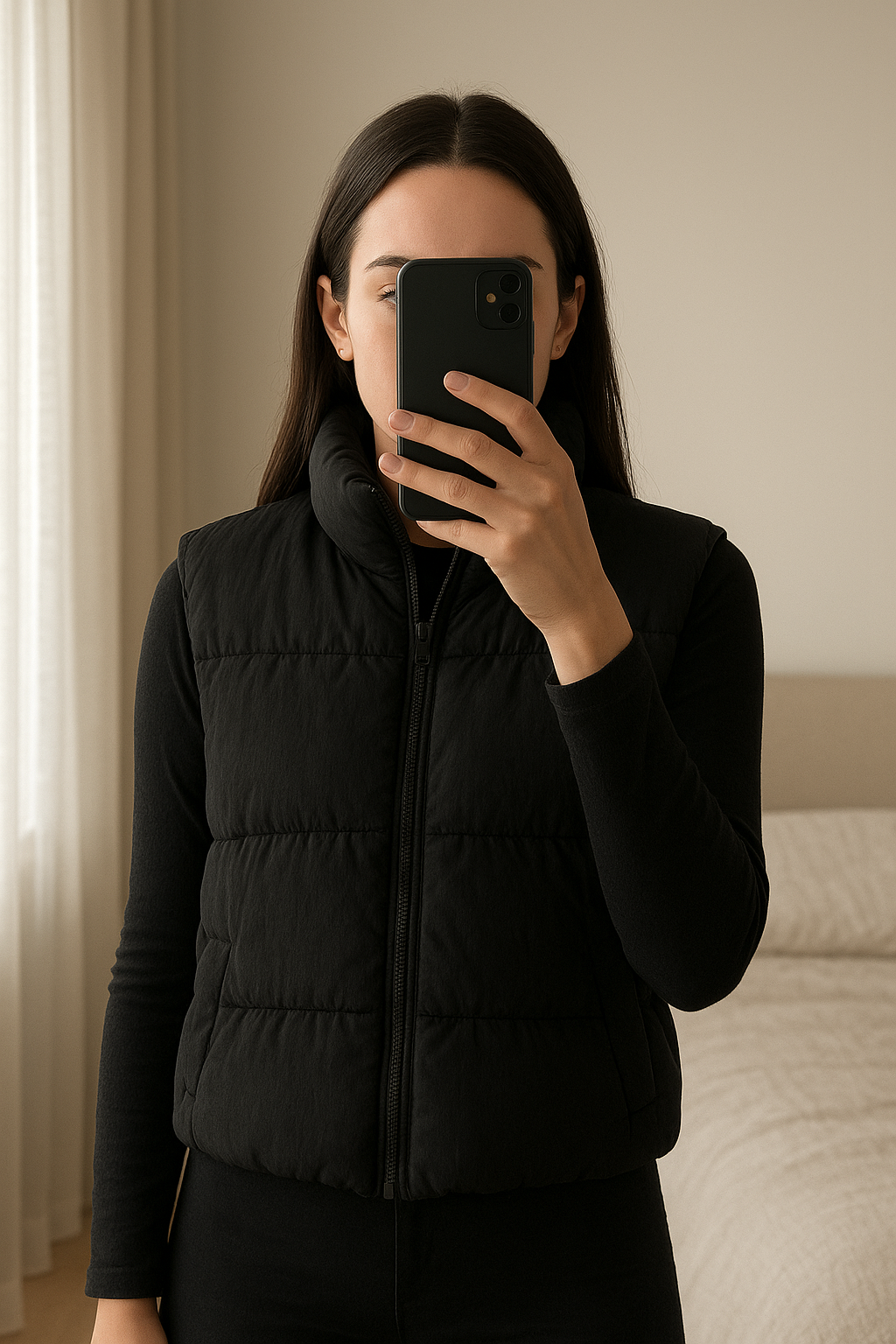 Veste sans manche noir debout, face à la caméra, dans une chambre à la lumière douce, avec une lumière naturelle filtrant par la fenêtre.