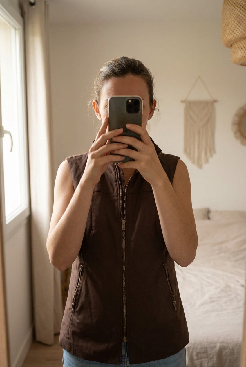 Veste sans manches chaude Nuni - Neuve de pie, mirando a la cámara, en un dormitorio con luz suave y natural filtrándose por la ventana.