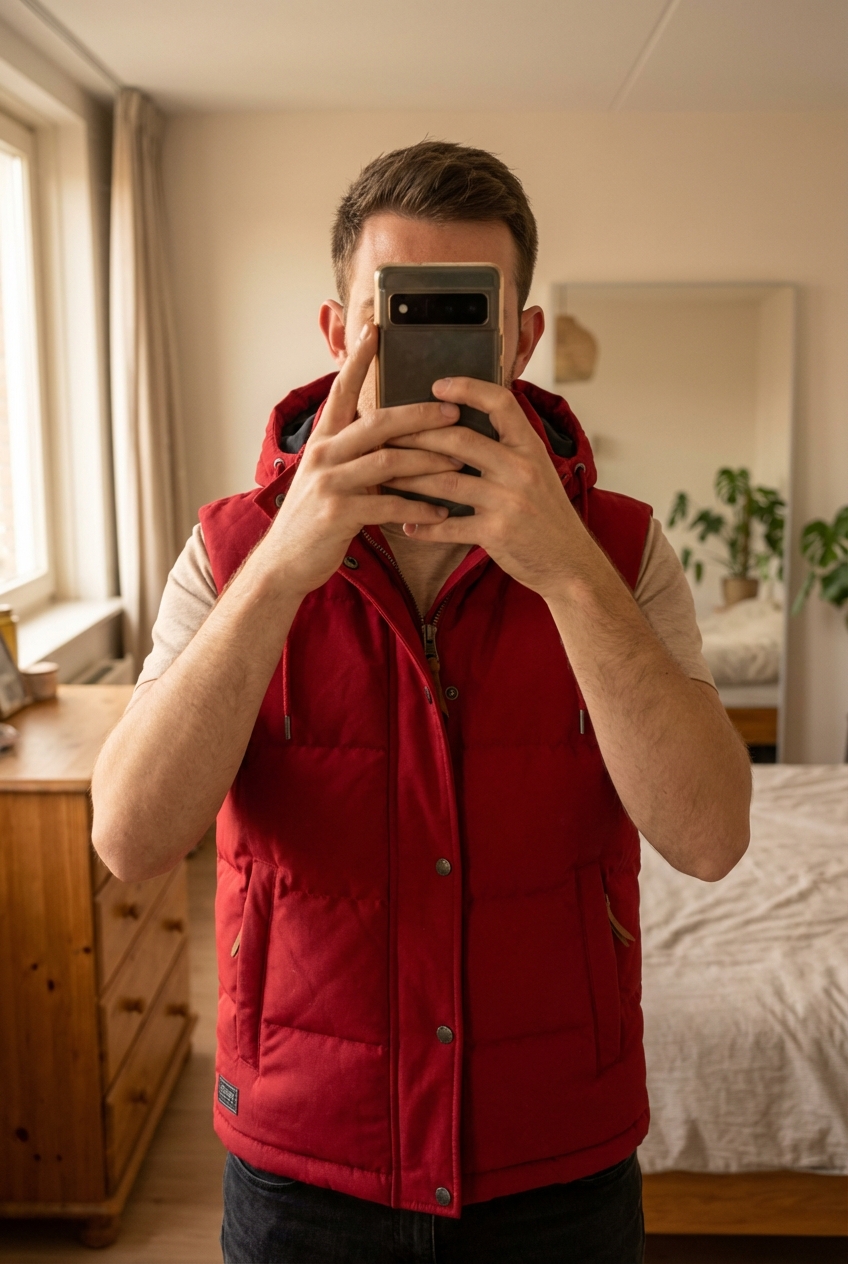 Veste sans manches Mixte SuperDry Prix Négociable debout, face à la caméra, dans une chambre à la lumière douce, avec une lumière naturelle filtrant par la fenêtre.
