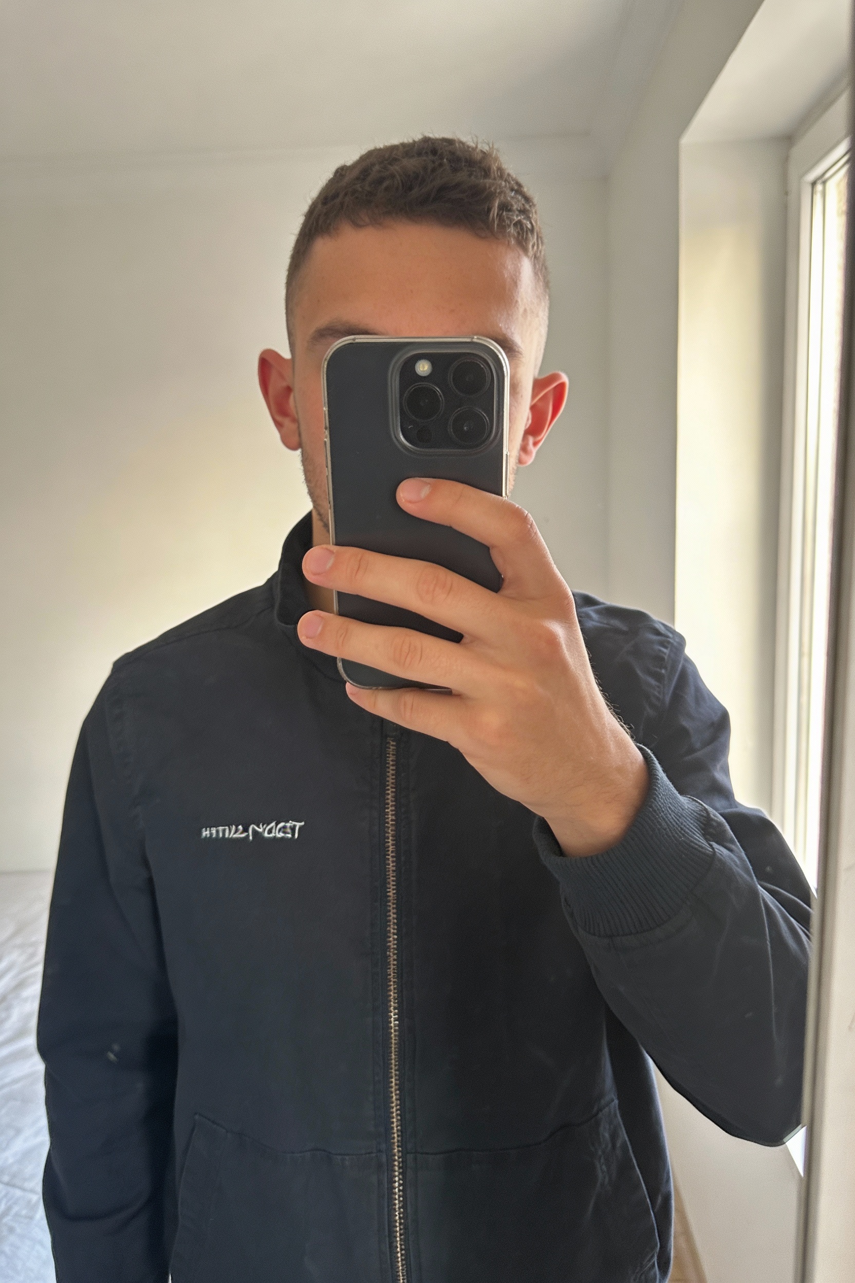 Veste Teddy Smith 14 ans debout, face à la caméra, dans une chambre à la lumière douce, avec une lumière naturelle filtrant par la fenêtre.