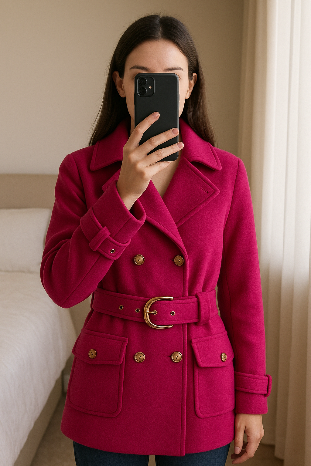 veste Versace en cachemire et laine rose debout, face à la caméra, dans une chambre à la lumière douce, avec une lumière naturelle filtrant par la fenêtre.