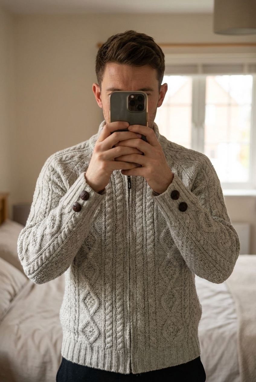 Veste Vintage Fait Main Tricot Aran Wool Sweater 100% Laine Mérinos Gris Aran Craft M debout, face à la caméra, dans une chambre à la lumière douce, avec une lumière naturelle filtrant par la fenêtre.