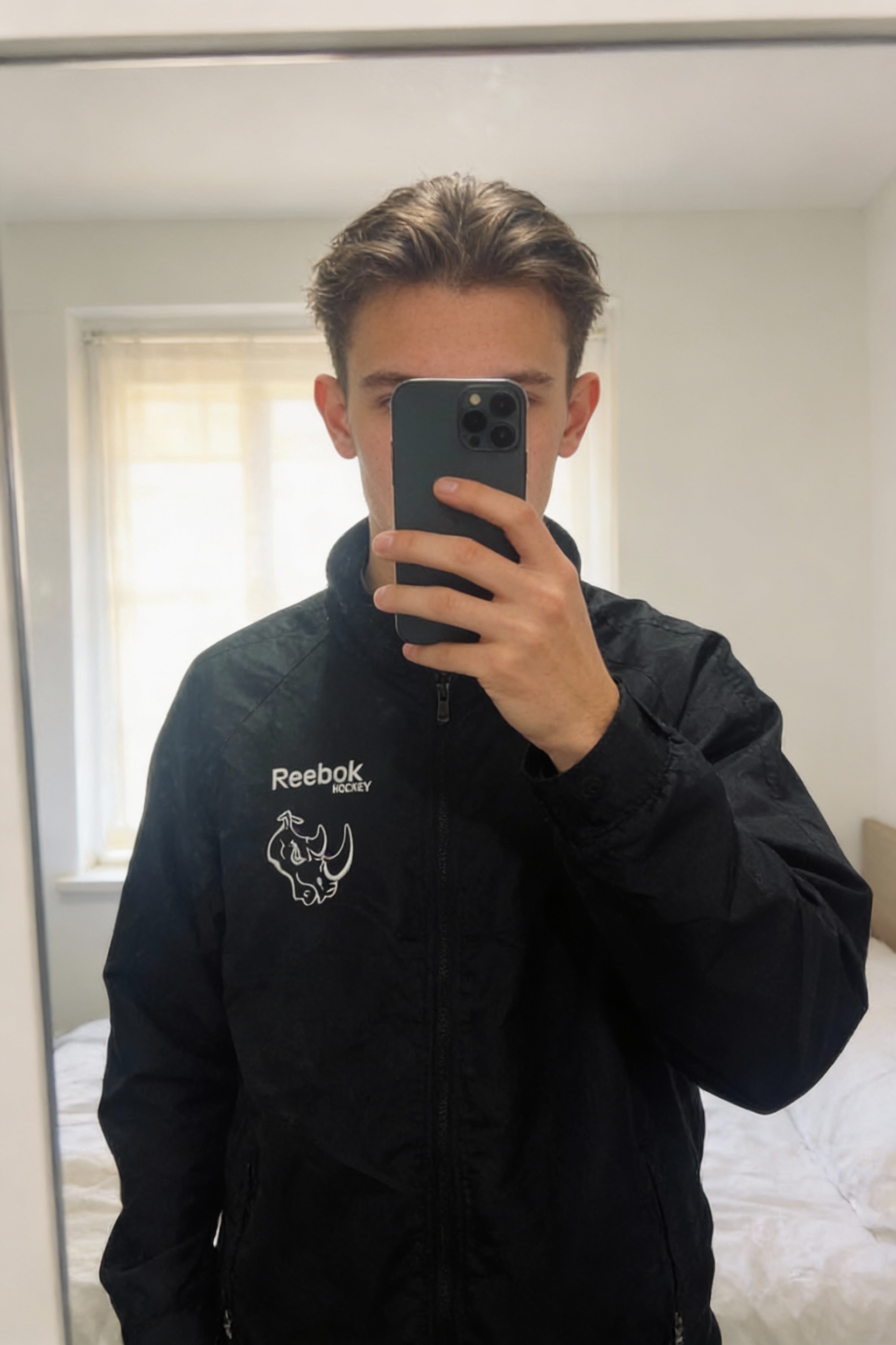 Veste Vintage Reebook Hockey taille M debout, face à la caméra, dans une chambre à la lumière douce, avec une lumière naturelle filtrant par la fenêtre.