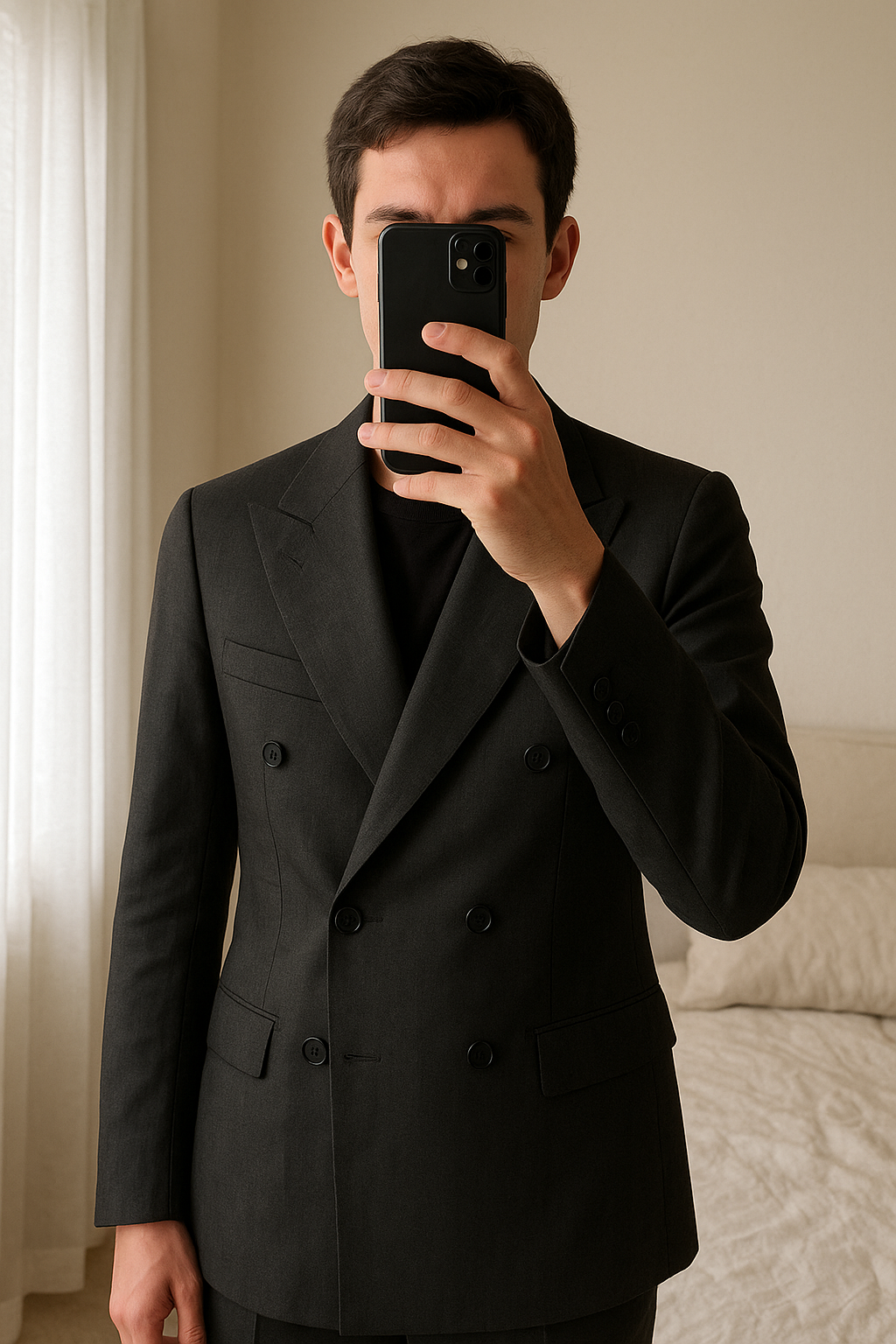 Veste Zara debout, face à la caméra, dans une chambre à la lumière douce, avec une lumière naturelle filtrant par la fenêtre.