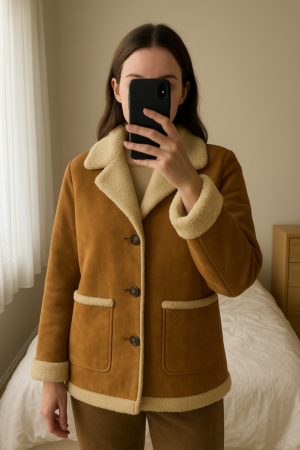 Veste Zara mouton camel debout, face à la caméra, dans une chambre à la lumière douce, avec une lumière naturelle filtrant par la fenêtre.