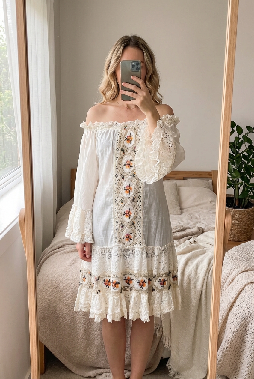 Vestido boho palabra de honor + REGALO chaleco de pie, mirando a la cámara, en un dormitorio con luz suave y natural filtrándose por la ventana.