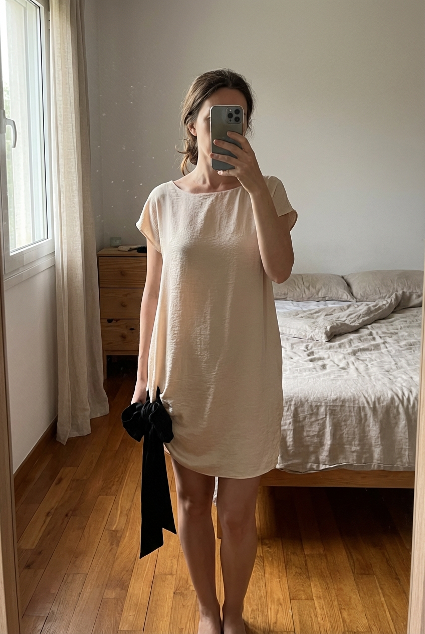 Vestido camisero de pie, mirando a la cámara, en un dormitorio con luz suave y natural filtrándose por la ventana.