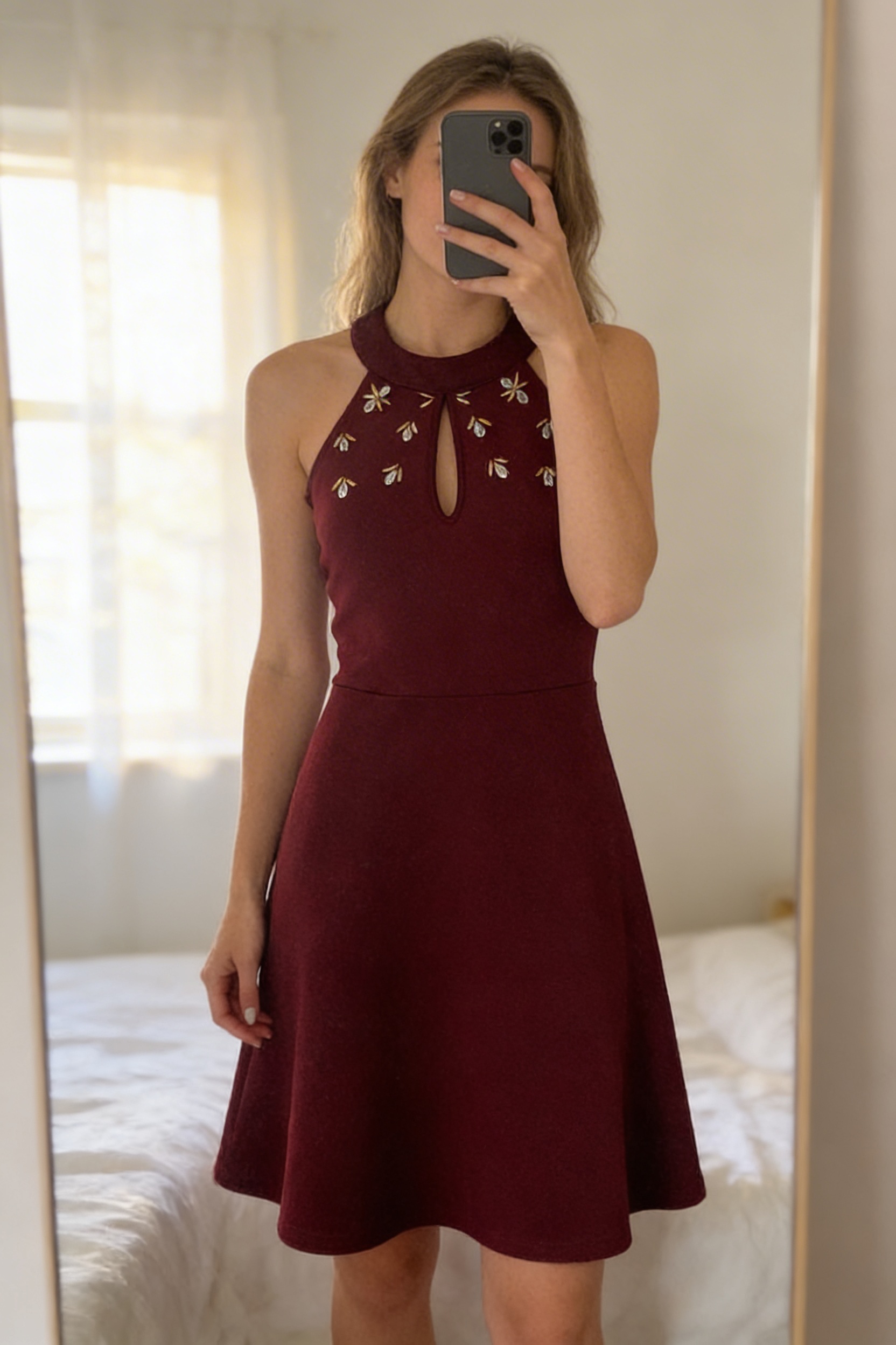 ⭐ Vestido Coquette Burdeos con Pedrería Talla S ⭐ de pie, mirando a la cámara, en un dormitorio con luz suave y natural filtrándose por la ventana.