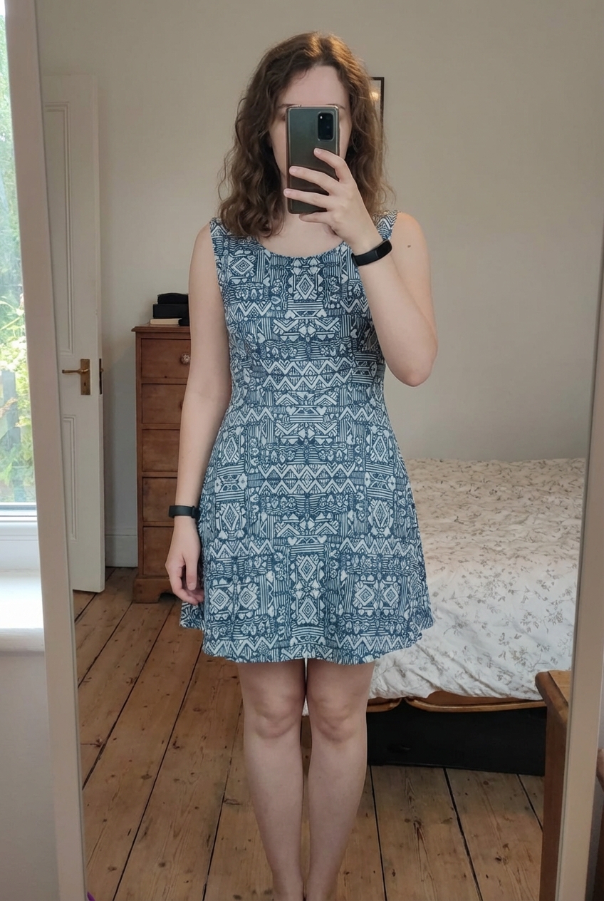 Vestido estampado de pie, mirando a la cámara, en un dormitorio con luz suave y natural filtrándose por la ventana.