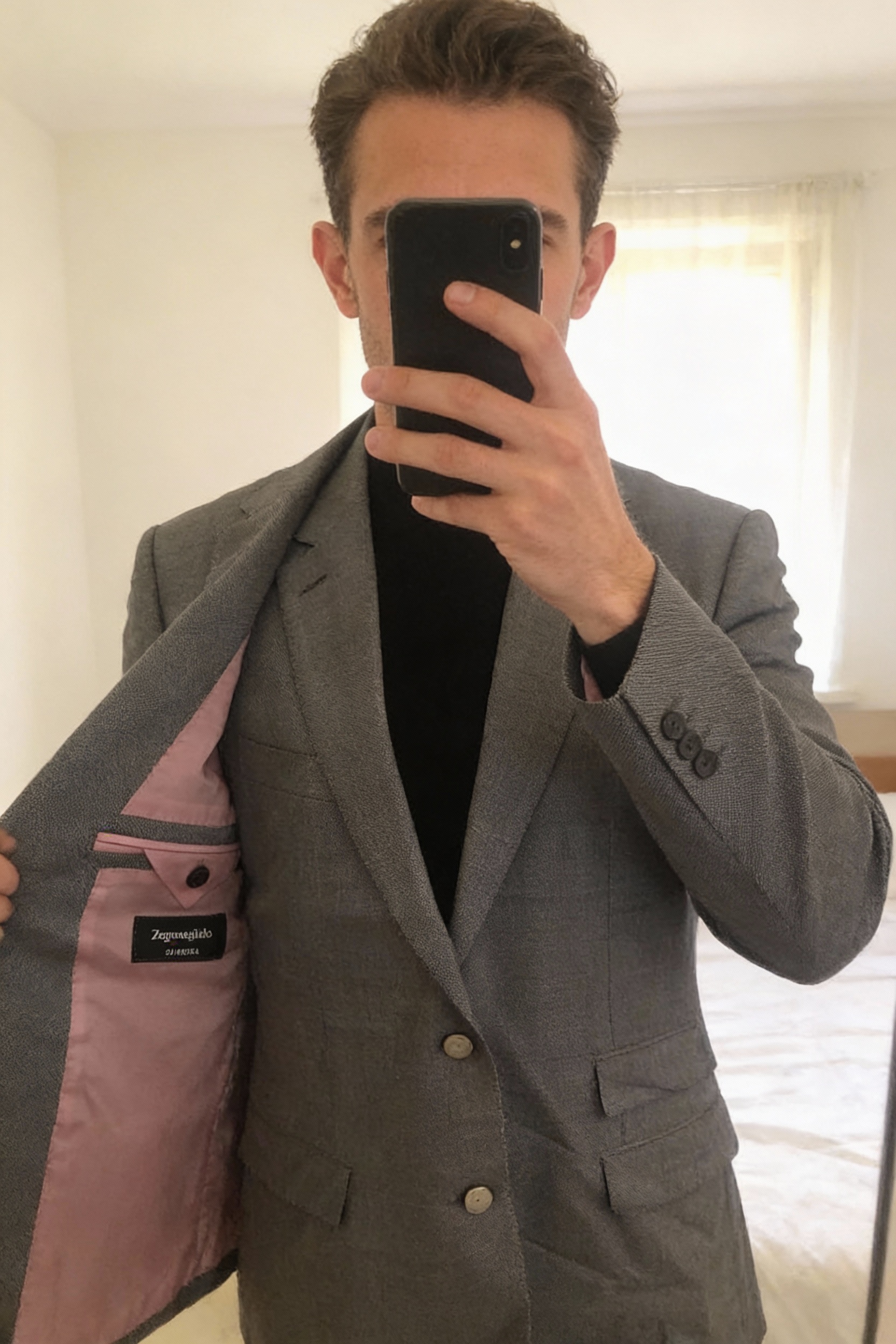 Veston Ermenegildo Zegna debout, face à la caméra, dans une chambre à la lumière douce, avec une lumière naturelle filtrant par la fenêtre.