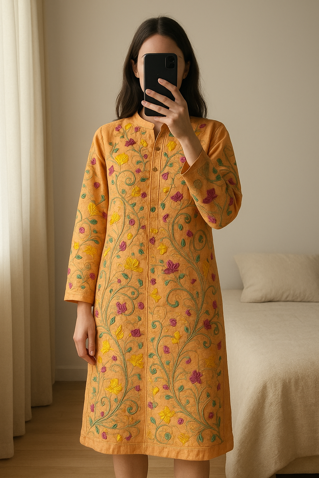 Vintage Embroidered Kashmiri embroidered Long Jacket / kimono standing straight facing the camera, in a softly lit bedroom setting, with gentle natural light filtering through a window.