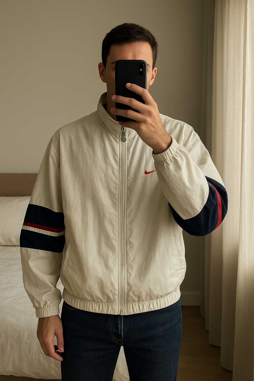 Vintage Nike Y2K Windbreaker Jacket M Retro 90s Streetwear Full Zip White Oversize de pie, mirando a la cámara, en un dormitorio con luz suave y natural filtrándose por la ventana.