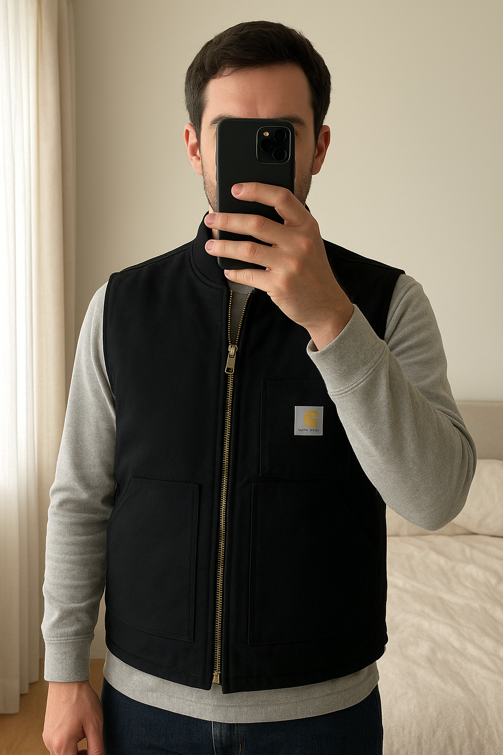 Vintage’s brown carhartt rework zip up insulated gilet men's S standing straight facing the camera, in a softly lit bedroom setting, with gentle natural light filtering through a window.