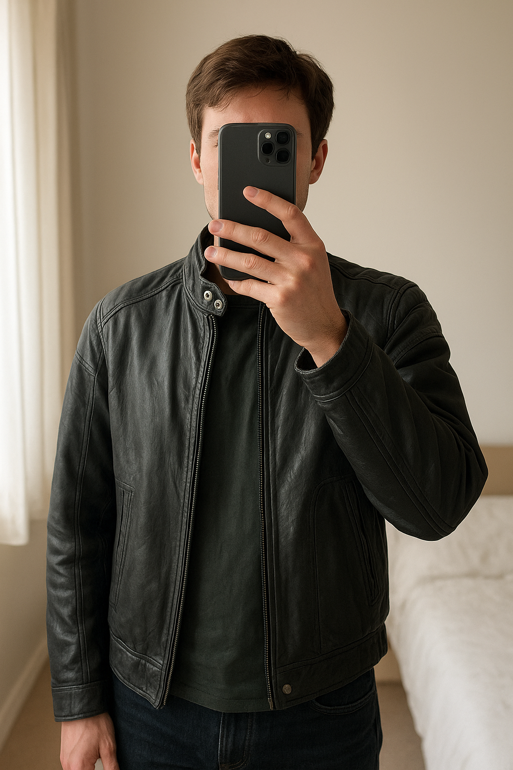 Vintage veste en cuir oversize Y2k état satisfaisant Taille L debout, face à la caméra, dans une chambre à la lumière douce, avec une lumière naturelle filtrant par la fenêtre.