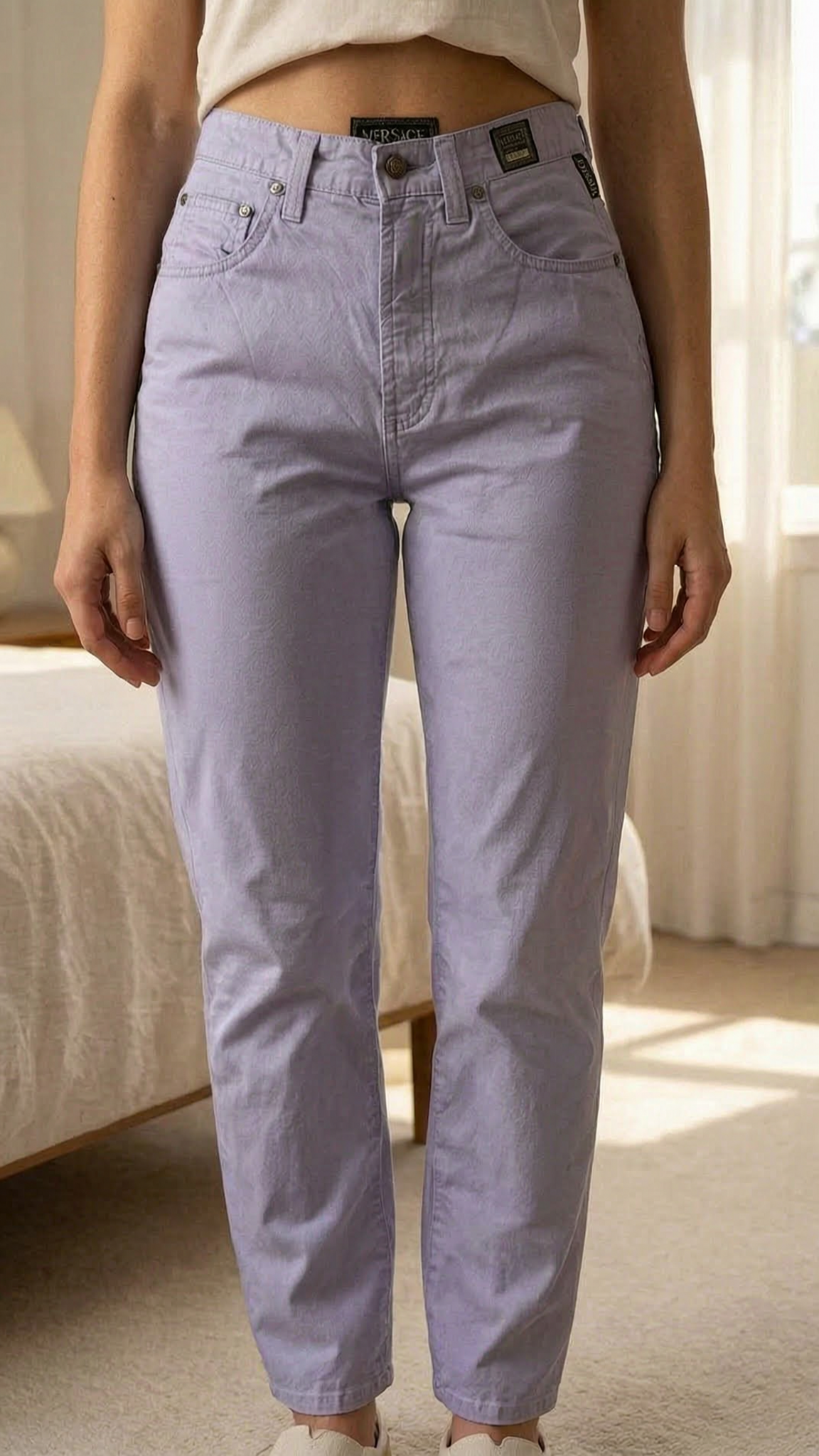 Vintage Y2K Versace Jeans Couture Lilac Jeans – UK 6 | Authentic Designer standing straight facing the camera, in a softly lit bedroom setting, with gentle natural light filtering through a window.
