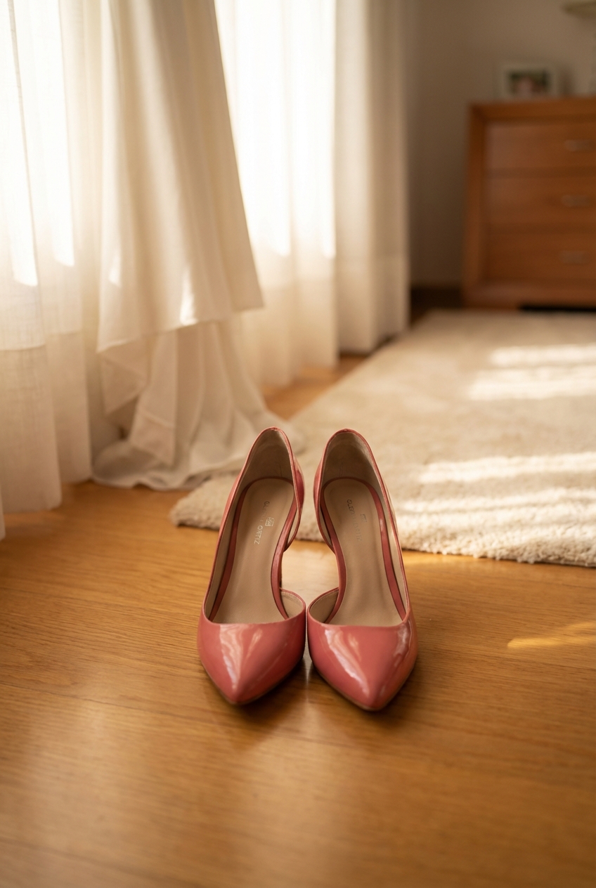 Zapatos tacón Gloria Ortiz Talla 38 Coral Charol de pie, mirando a la cámara, en un dormitorio con luz suave y natural filtrándose por la ventana.