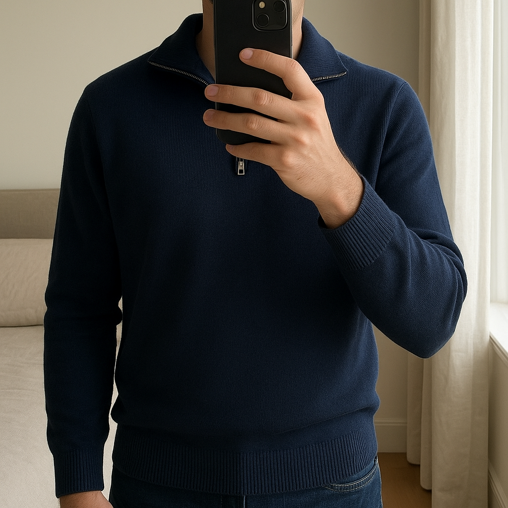 Zara man de pie, mirando a la cámara, en un dormitorio con luz suave y natural filtrándose por la ventana.