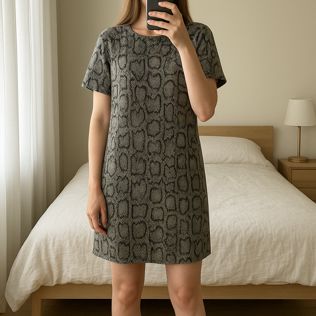 Abito a tubino con maniche corte in piedi, rivolto verso la fotocamera, in una camera da letto con luce soffusa e luce naturale che filtra dalla finestra.