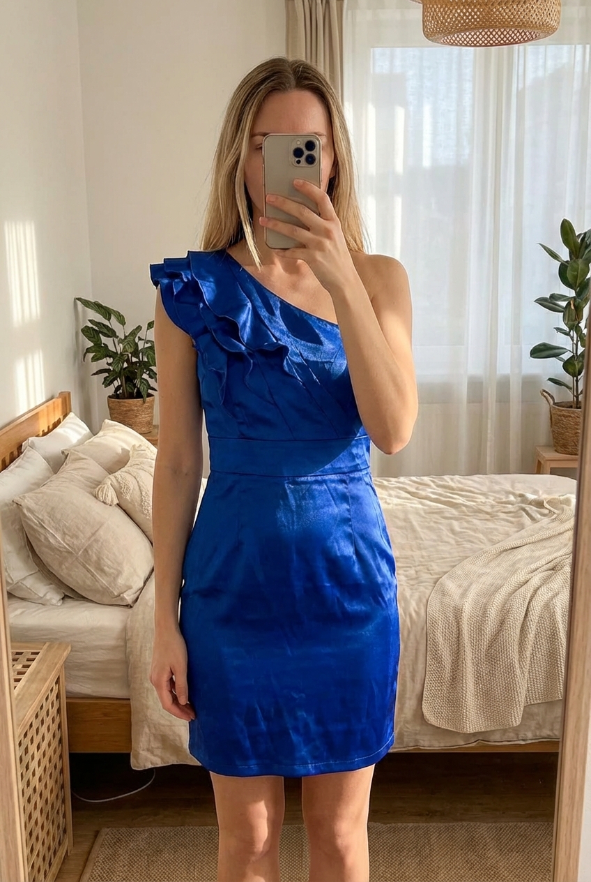 Abito elegante monospalla blu elettrico Cod.3237 in piedi, rivolto verso la fotocamera, in una camera da letto con luce soffusa e luce naturale che filtra dalla finestra.