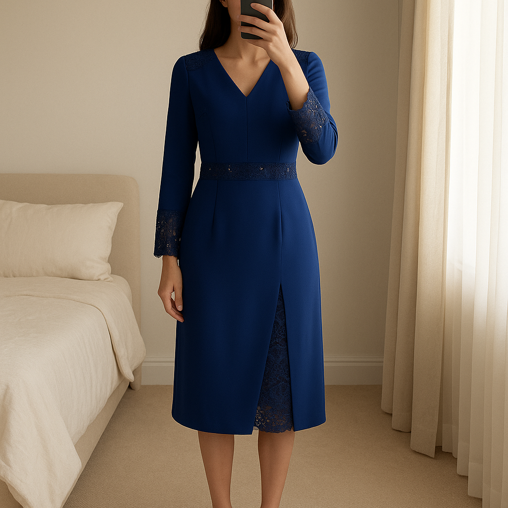 Abito elegante viola impero couture in piedi, rivolto verso la fotocamera, in una camera da letto con luce soffusa e luce naturale che filtra dalla finestra.
