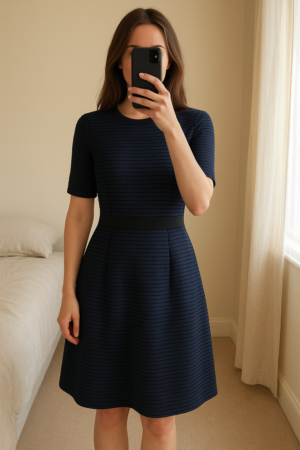 Abito Intrend blu scuro con righe nere taglia L in piedi, rivolto verso la fotocamera, in una camera da letto con luce soffusa e luce naturale che filtra dalla finestra.