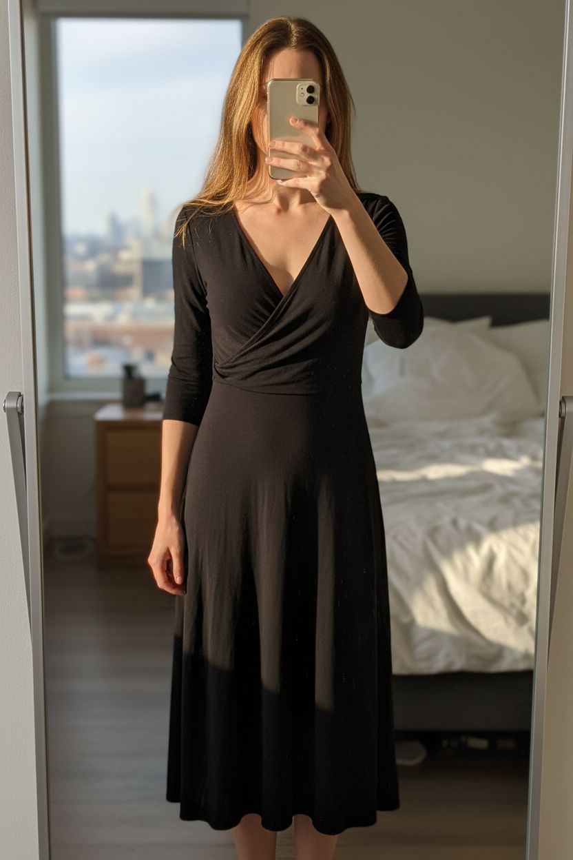 Abito nero in piedi, rivolto verso la fotocamera, in una camera da letto con luce soffusa e luce naturale che filtra dalla finestra.