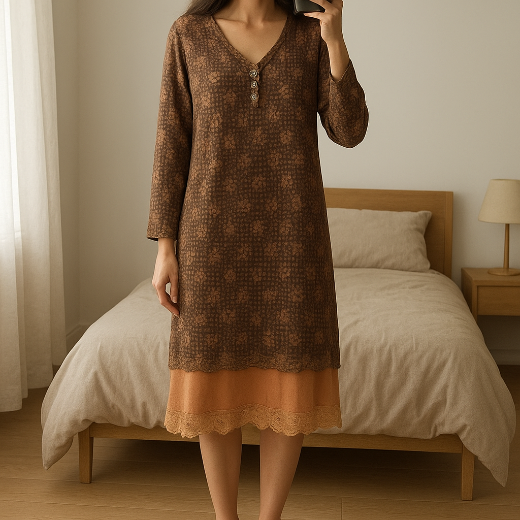 Abito twin set in piedi, rivolto verso la fotocamera, in una camera da letto con luce soffusa e luce naturale che filtra dalla finestra.