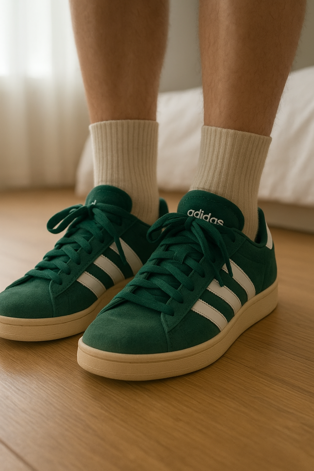 Adidas debout, face à la caméra, dans une chambre à la lumière douce, avec une lumière naturelle filtrant par la fenêtre.