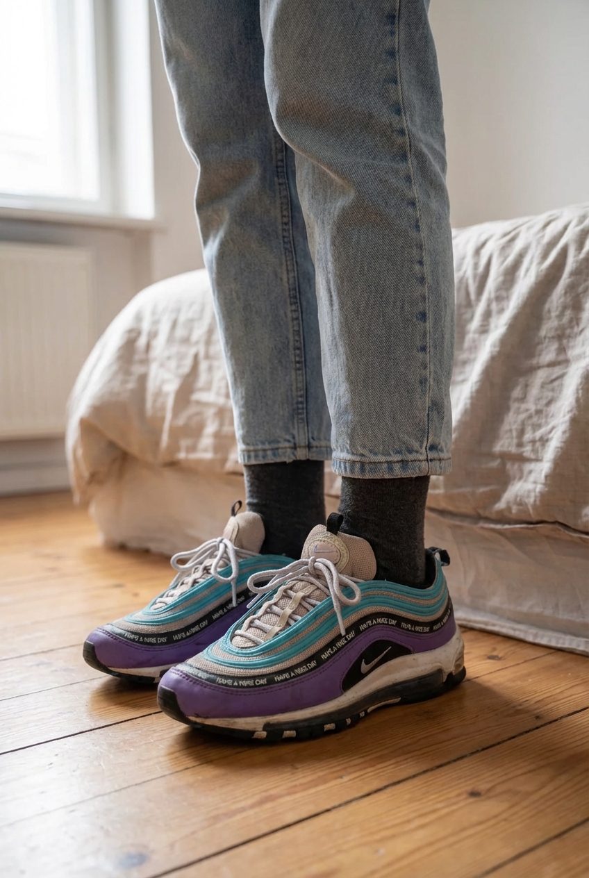 Air max 97 Have a Nike day debout, face à la caméra, dans une chambre à la lumière douce, avec une lumière naturelle filtrant par la fenêtre.