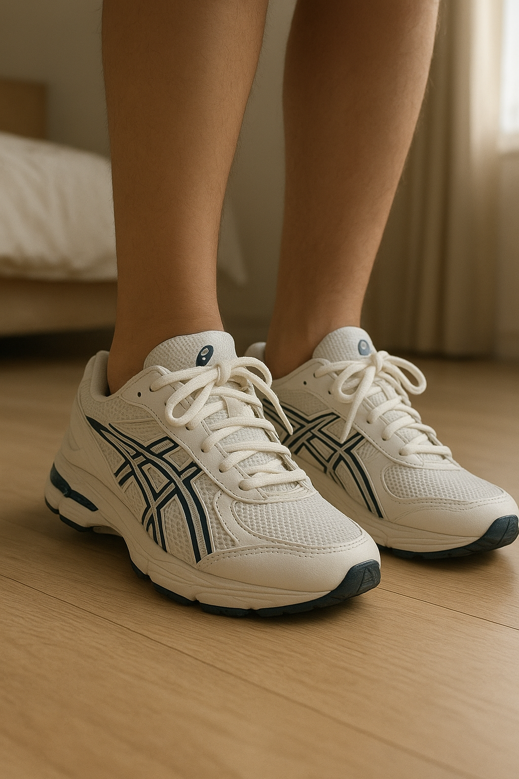 Asics nyc debout, face à la caméra, dans une chambre à la lumière douce, avec une lumière naturelle filtrant par la fenêtre.