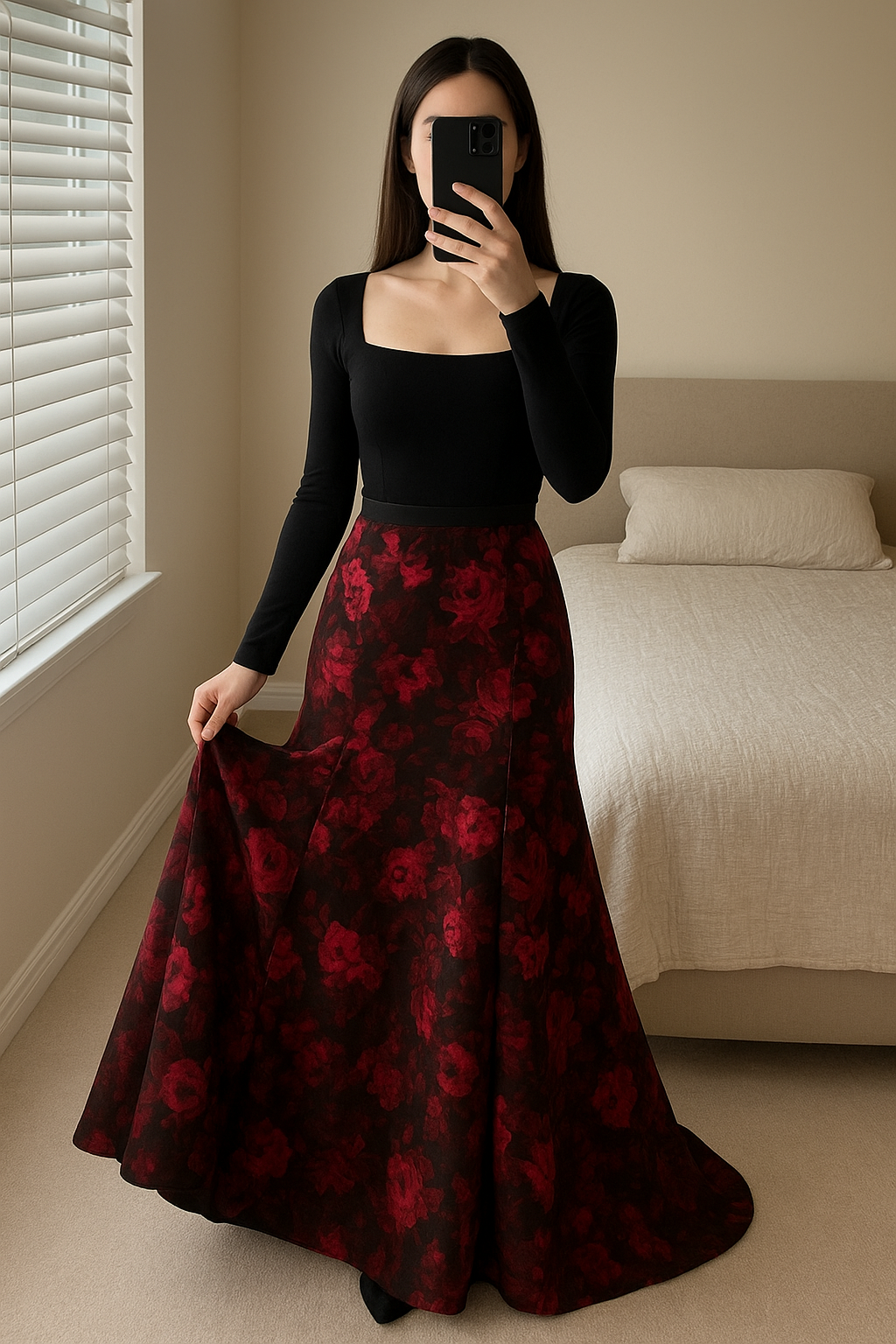 Avery G Evening dress -size 12 standing straight facing the camera, in a softly lit bedroom setting, with gentle natural light filtering through a window.