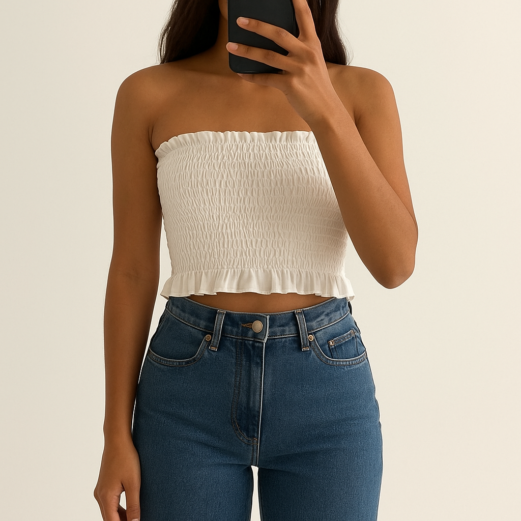 Une personne en Bandeau / Top Tube smocké SHEIN Blanc à volants - T. Petite M debout, face à la caméra, dans un studio photo épuré avec fond blanc et éclairage doux.