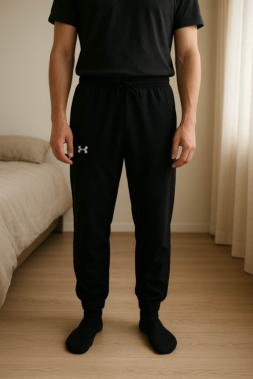 Bas de survêtement under armour debout, face à la caméra, dans une chambre à la lumière douce, avec une lumière naturelle filtrant par la fenêtre.