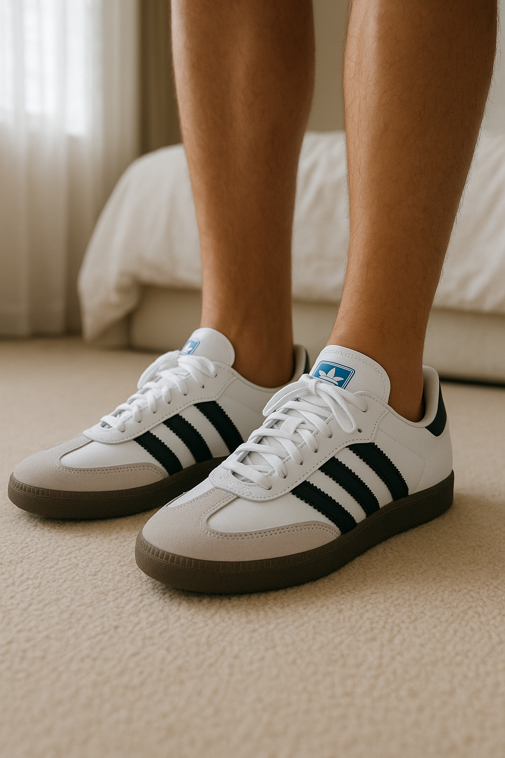 Basket adidas samba blanche et noir taille 39 debout, face à la caméra, dans une chambre à la lumière douce, avec une lumière naturelle filtrant par la fenêtre.
