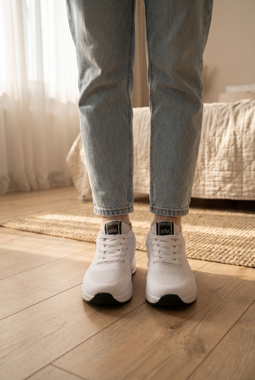Basket blanche debout, face à la caméra, dans une chambre à la lumière douce, avec une lumière naturelle filtrant par la fenêtre.