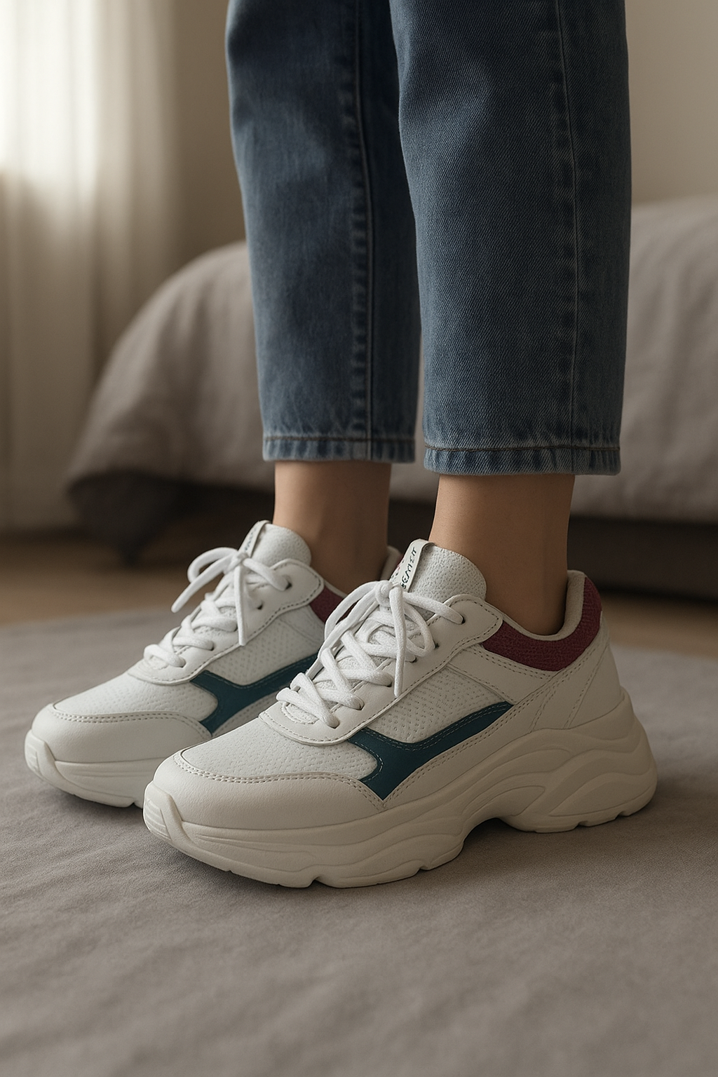 Basket ellesse debout, face à la caméra, dans une chambre à la lumière douce, avec une lumière naturelle filtrant par la fenêtre.