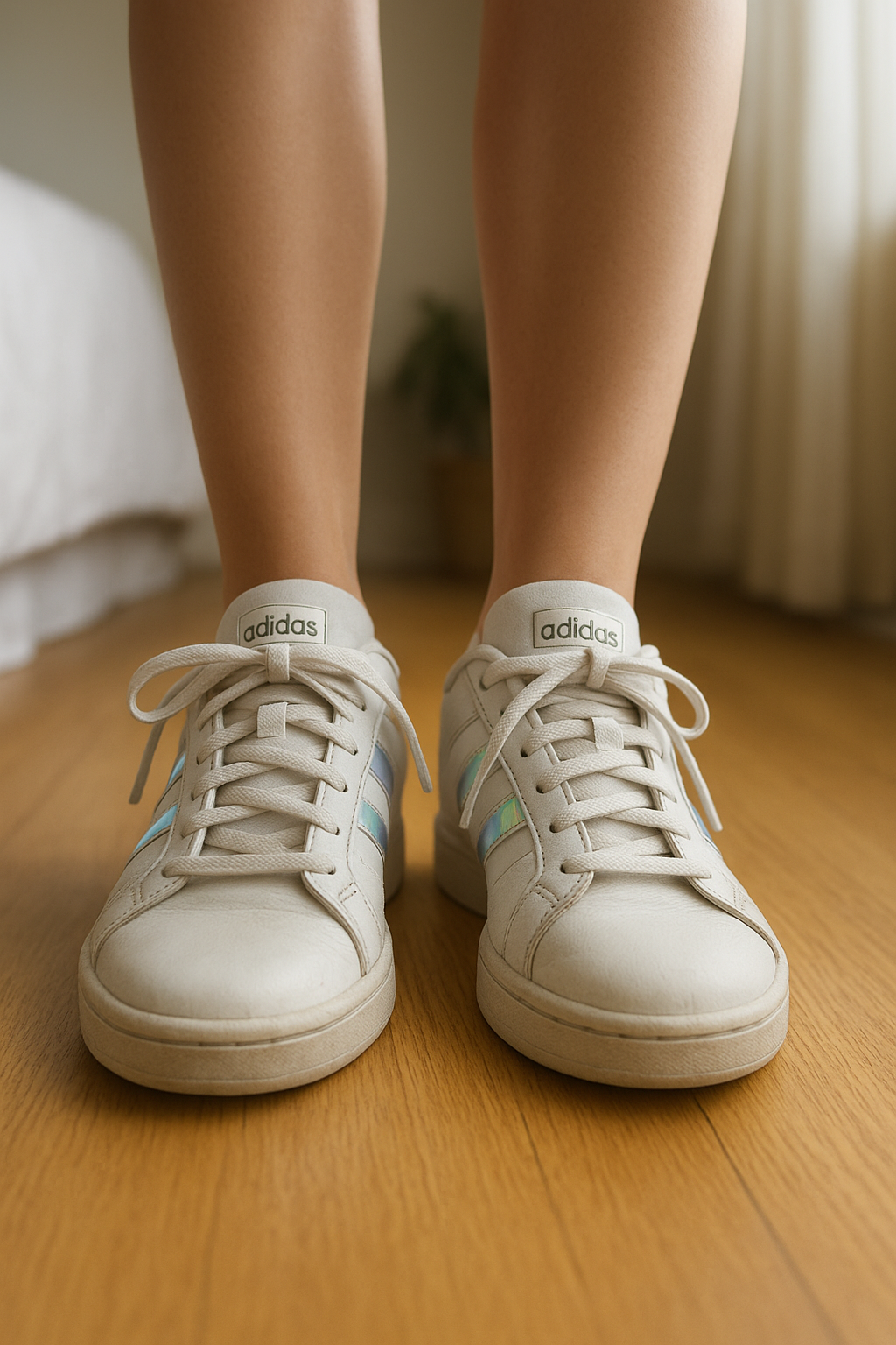 Baskets debout, face à la caméra, dans une chambre à la lumière douce, avec une lumière naturelle filtrant par la fenêtre.