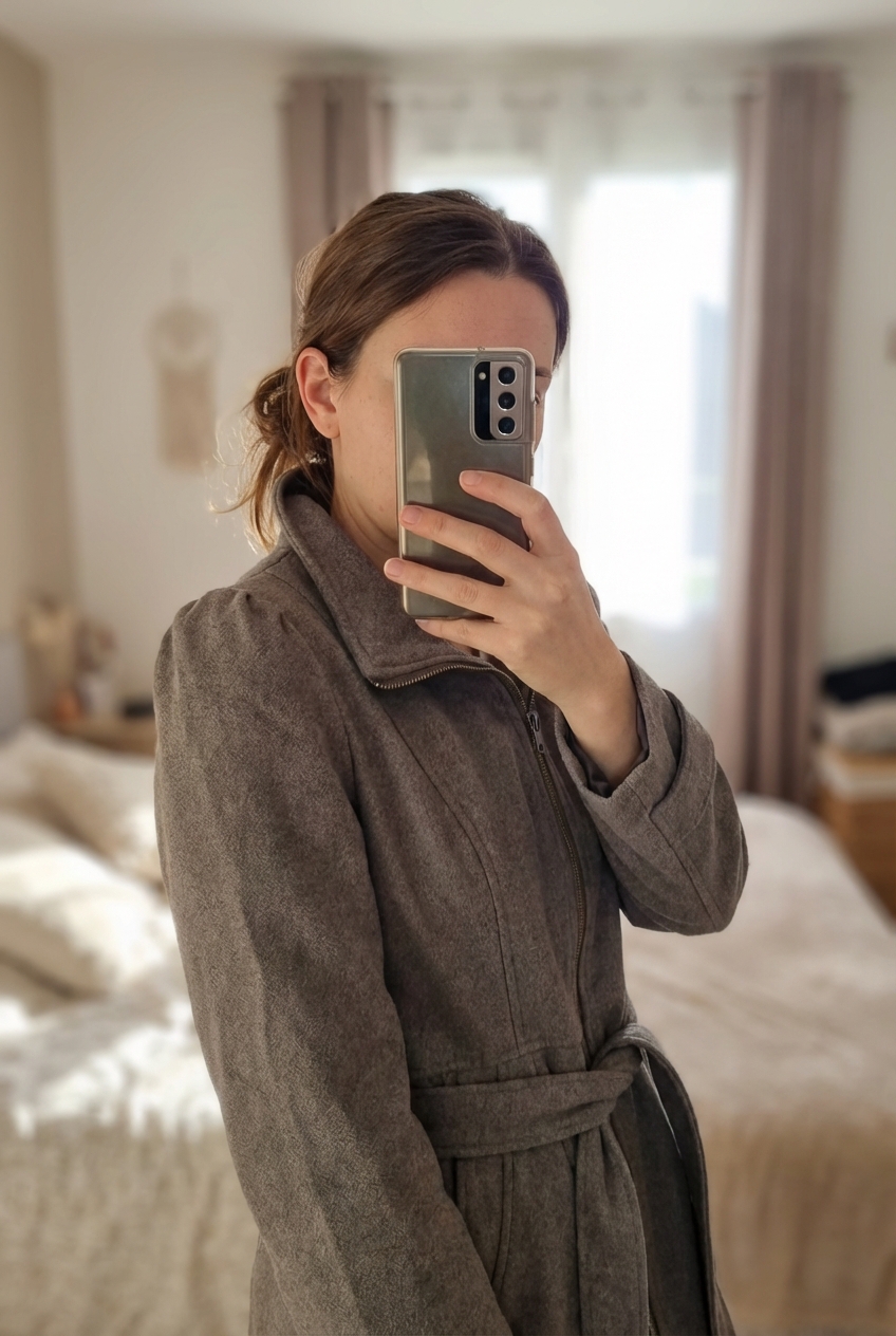 Une personne en Beau manteau laine gris à zip debout, face à la caméra, dans une chambre à la lumière douce, avec une lumière naturelle filtrant par la fenêtre.