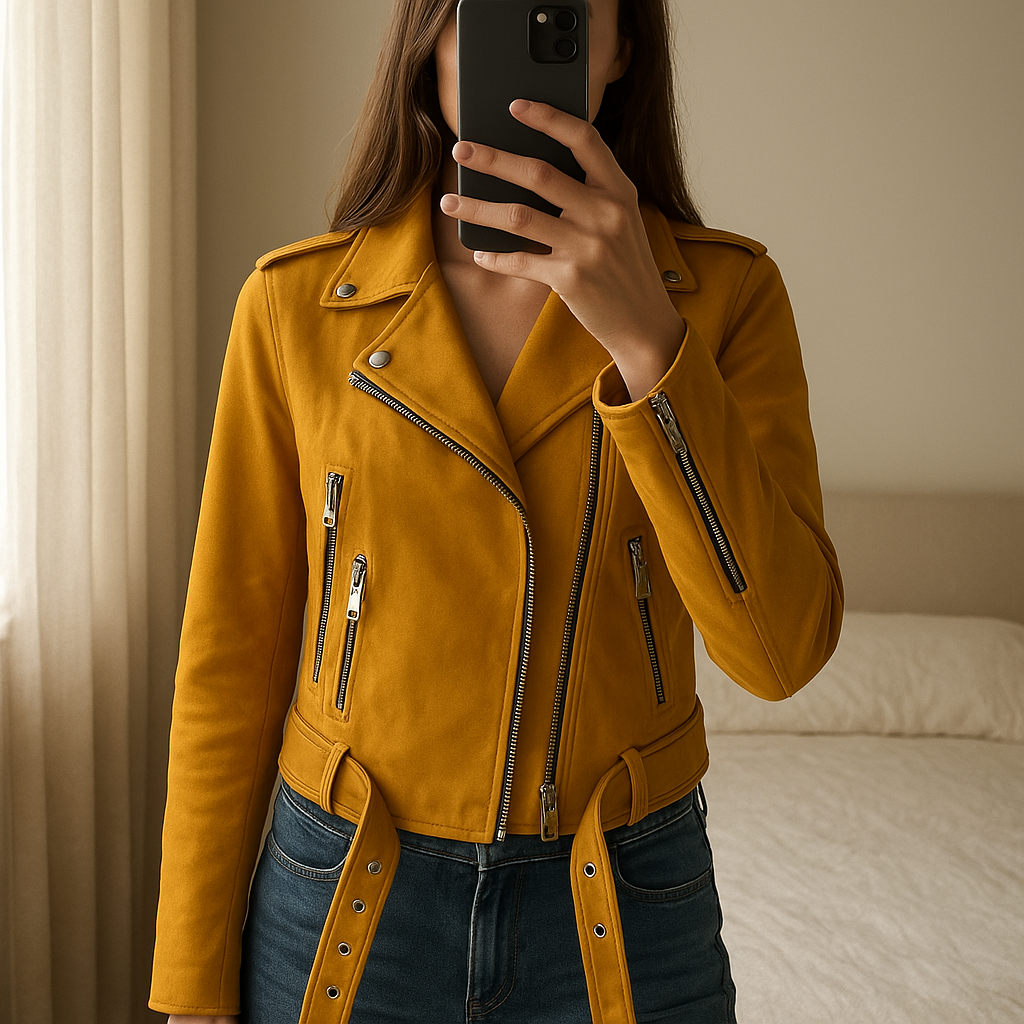 Biker giallo ocra in piedi, rivolto verso la fotocamera, in una camera da letto con luce soffusa e luce naturale che filtra dalla finestra.