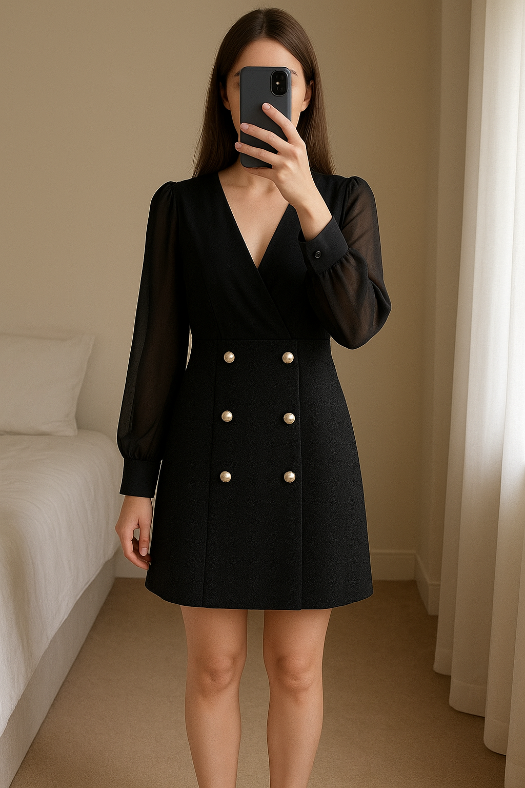 Black chiffon sleeve tweed mini dress with pearl button detail – EU 36 / UK 8 standing straight facing the camera, in a softly lit bedroom setting, with gentle natural light filtering through a window.