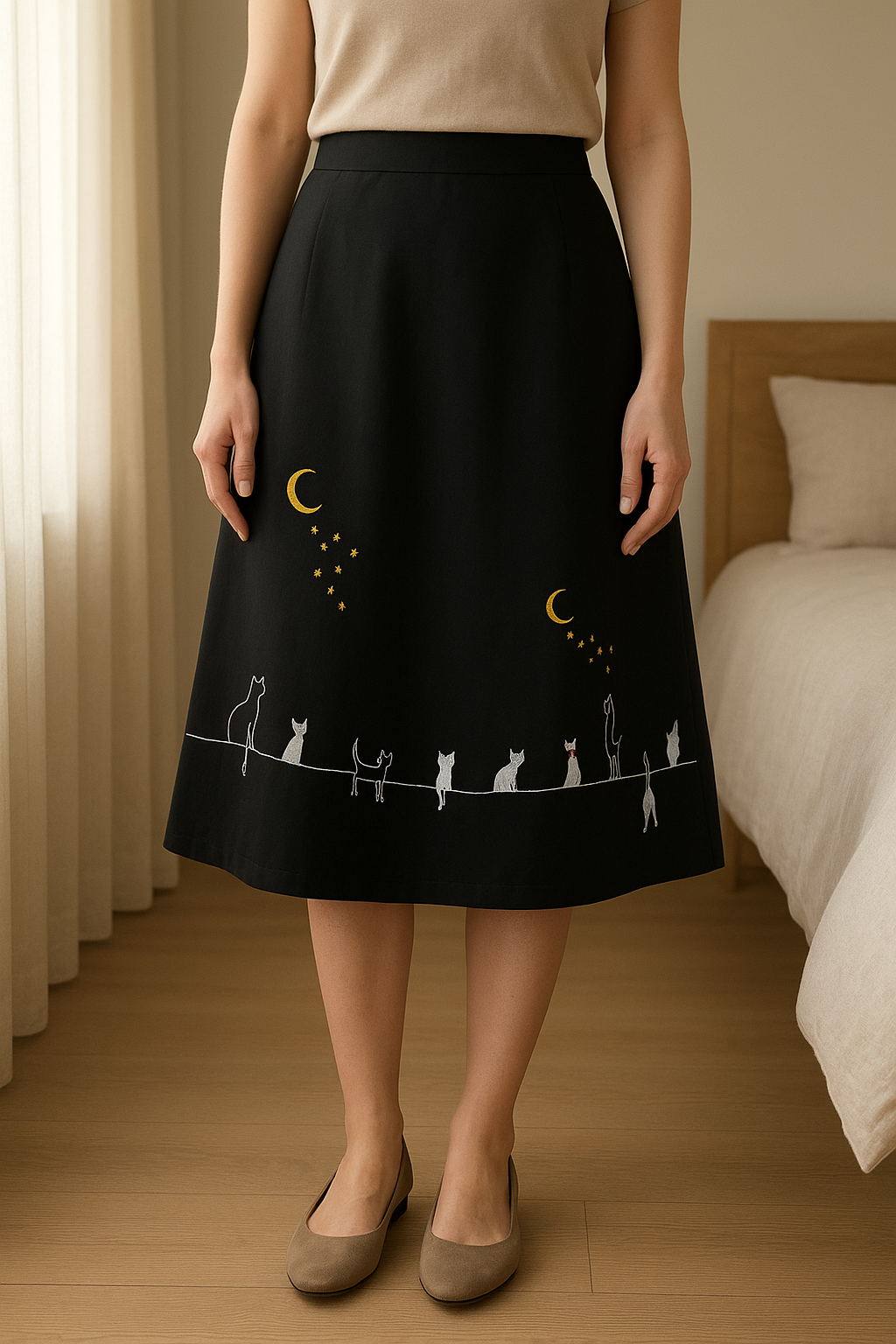 Black etro skirt with cats from Banned debout, face à la caméra, dans une chambre à la lumière douce, avec une lumière naturelle filtrant par la fenêtre.