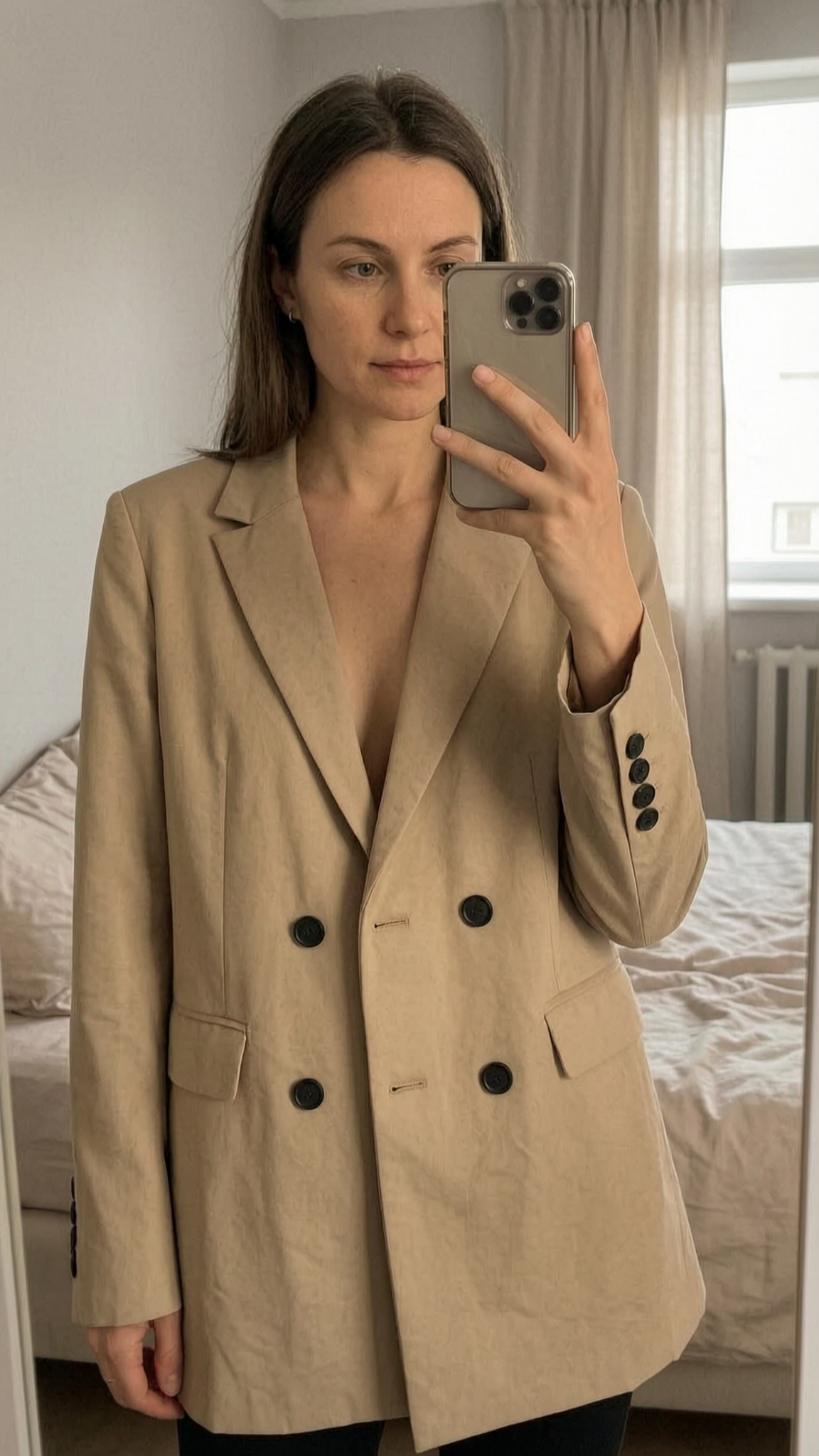 Blazer beige femme M - blazer donna in piedi, rivolto verso la fotocamera, in una camera da letto con luce soffusa e luce naturale che filtra dalla finestra.