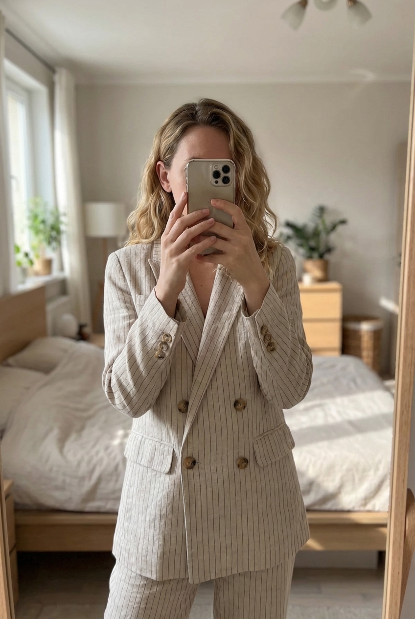 Blazer Beige Rayures Camaieu Taille S debout, face à la caméra, dans une chambre à la lumière douce, avec une lumière naturelle filtrant par la fenêtre.