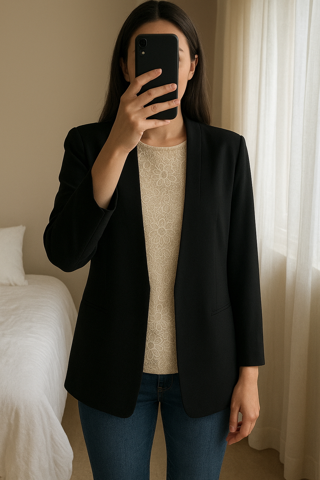 Blazer donna alta moda nero taglia L misure in foto in piedi, rivolto verso la fotocamera, in una camera da letto con luce soffusa e luce naturale che filtra dalla finestra.