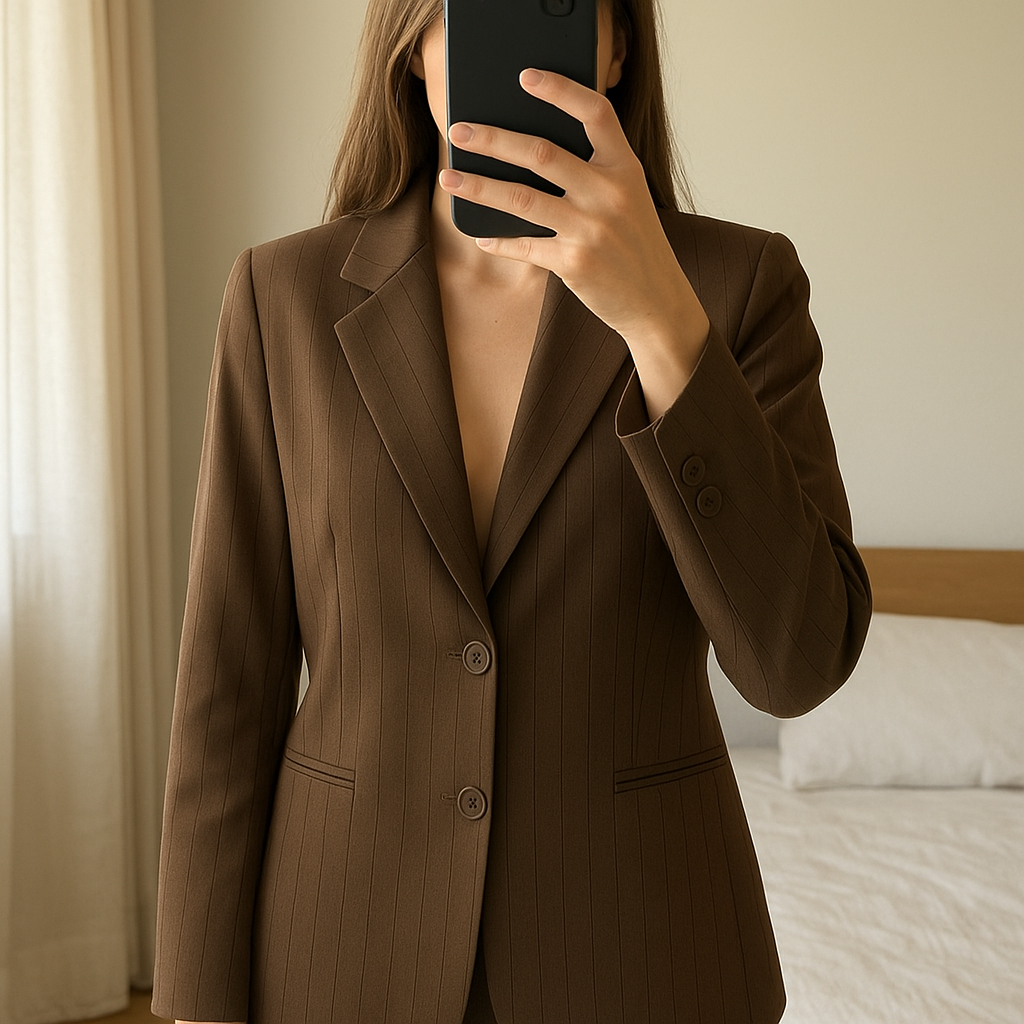 Une personne en Blazer Kaki Taille 40 debout, face à la caméra, dans une chambre à la lumière douce, avec une lumière naturelle filtrant par la fenêtre.