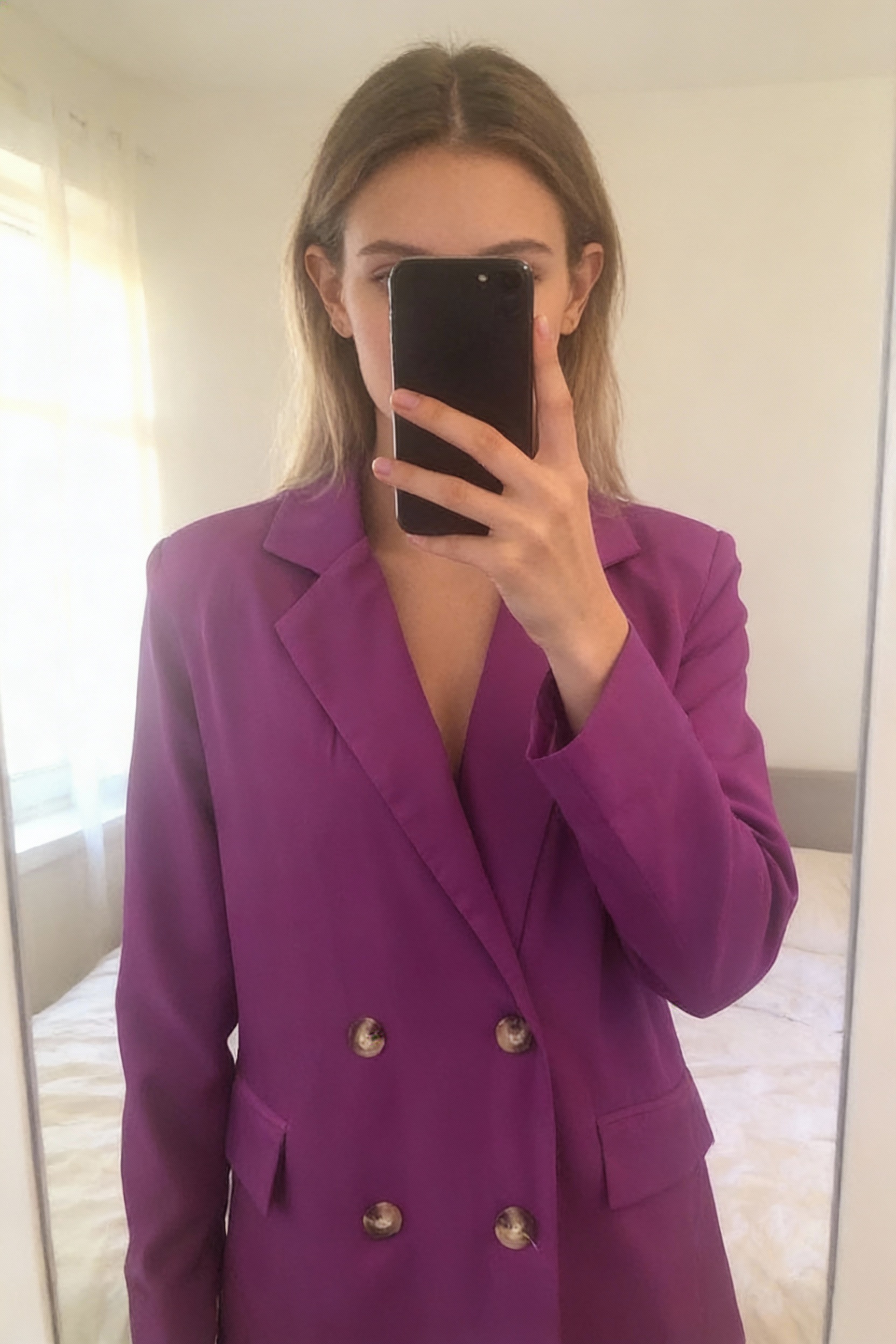 Blazer long taille M debout, face à la caméra, dans une chambre à la lumière douce, avec une lumière naturelle filtrant par la fenêtre.