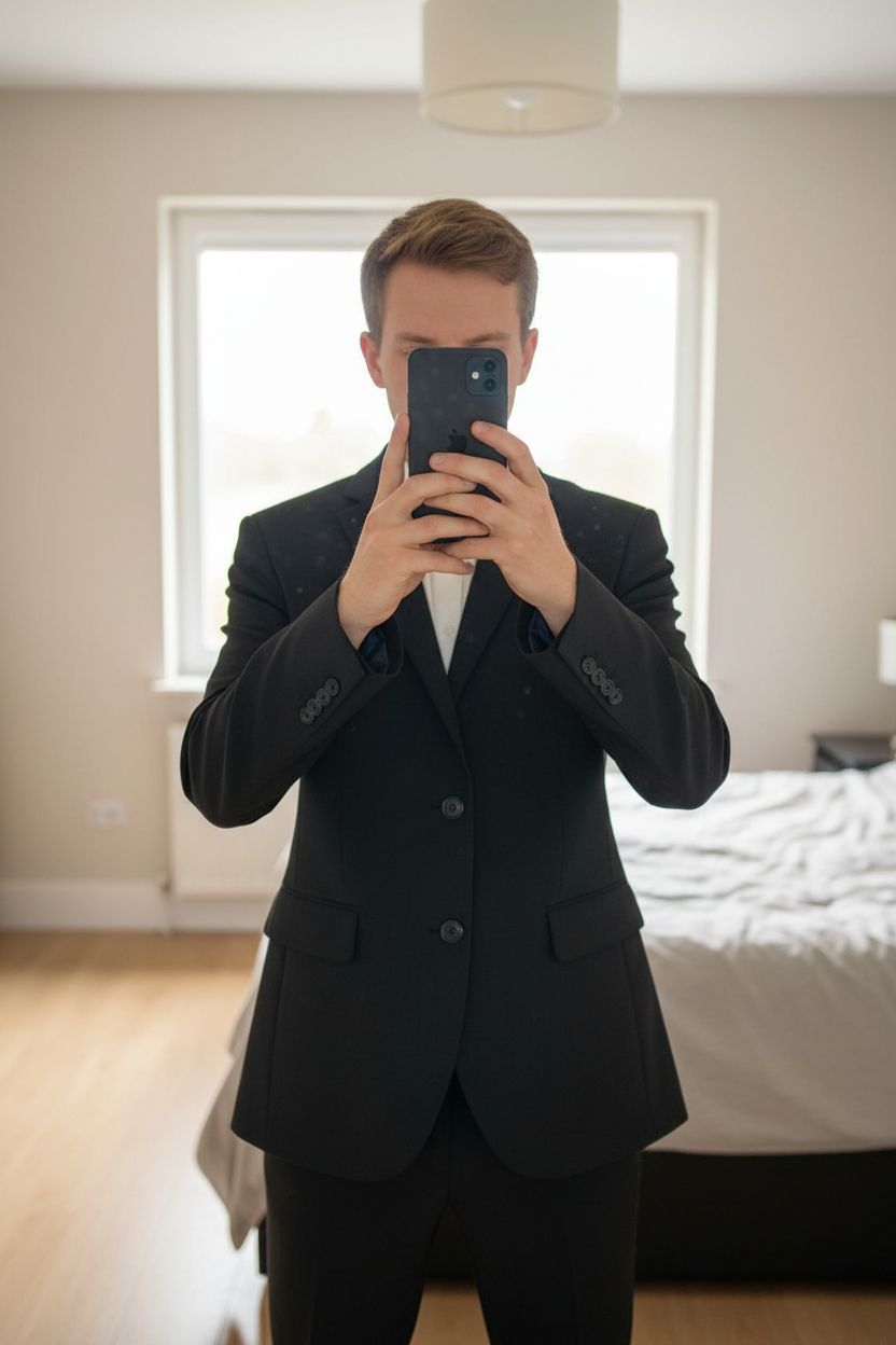 Blazer noir Guy Laroche - collection Musée du Louvre debout, face à la caméra, dans une chambre à la lumière douce, avec une lumière naturelle filtrant par la fenêtre.